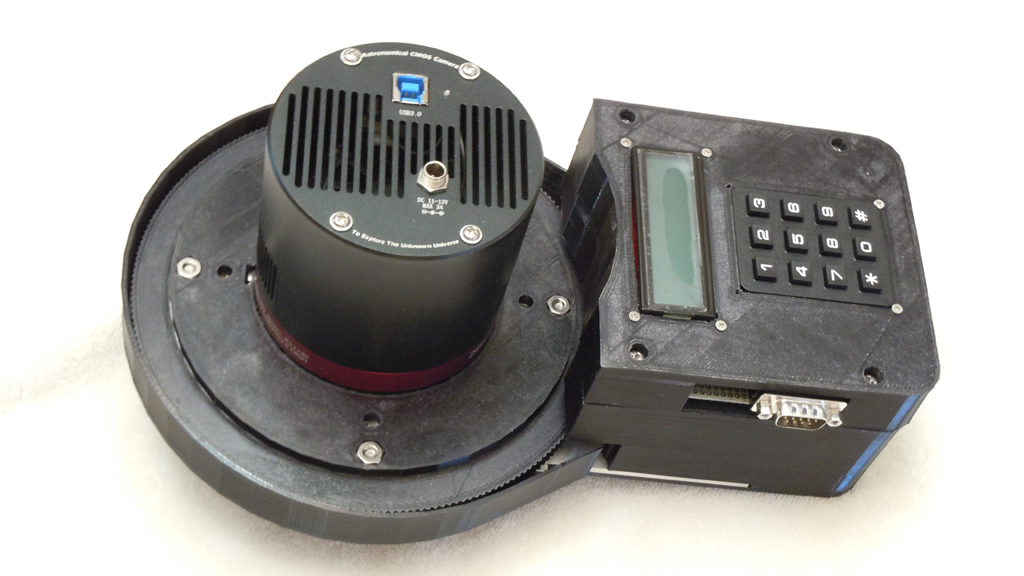 Skyro has a 3.5 inch socket to fit cameras such as the QHY168C as shown here. There is 5" of clearance around the rotating plate. The back focus consumption is 4mm. The telescope mount is a standard 2" in this prototype, but other adapters are possible.